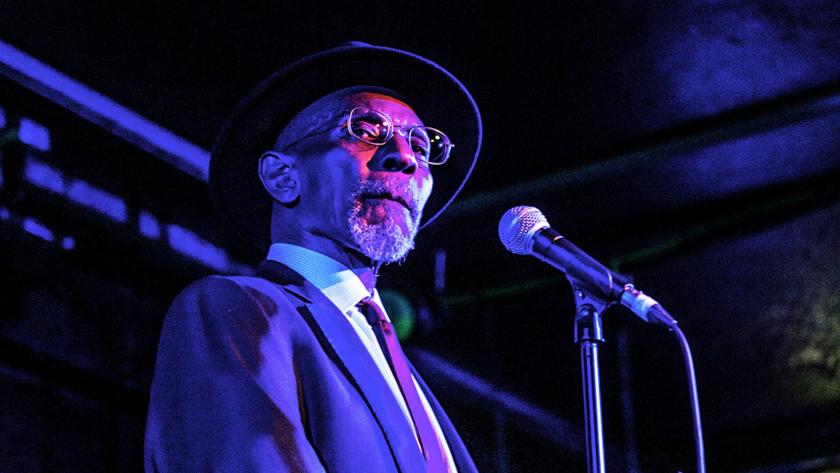 Straight-backed at 70, Linton Kwesi Johnson wears the smart garb of a British Caribbean elder – trilby, cream jacket, West Indies maroon jumper and tie, grey trousers, blue socks and grey shoes. His voice has resonant, slow-rolling authority befitting Britain’s pioneer, premier dub poet. He folds his legs, but raises a lecturing finger. Though relatively relaxed and ready to laugh, he shows, in attitude as much as posture, a stern, iron backbone.