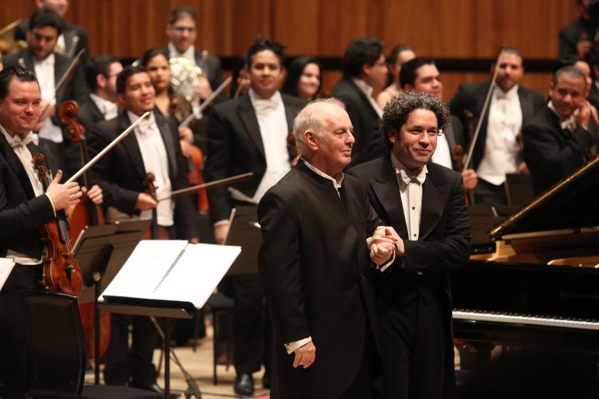 The speech ranged wider too. There was a story of Hitler marking up a score of Lohengrin, of Stalin sending money to pianist Maria Yudina and receiving the response “I will give the money to the families of your victims.” And, as was to be expected, here was unstinting praise for Dudamel and for the Sistema project and for the 750,000 children who have gone through it. Barenboim had just played both of the monumental Brahms piano concertos, and even a little, sudden, unscheduled encore (a beautifully skittish "Traumes Wirren" from Schumann's Fantasiestücke, Op12) which had left Southbank's Artistic Director briefly stranded on stage, speech-ready with microphone.And the concert. To me, the opening of the second movement of the second concerto summed up in microcosm both its considerable delights and also its frustrations. Barenboim launched in, carrying authority, depth of sound and feeling. The orchestra's horns and then the lower strings brought out the perfect accompaniment. They followed his every tic, every little expressive acceleration and hesitation in complete lock-step. The sound of those lower strings bringing out the glory of the D minor melody was full, resonant, and totally heart-warming. But then came the problem: a unison melody in the upper strings marked with the instruction “tranquillo e dolce.” Dudamel wilfully chooses to read the Italian expression as meaning a slamming on of the brakes, as if as long as is humanly possible needs to be spent wallowing in that phrase, the only possible limit being what the length of a violin bow will allow. Such instances had plagued the first concerto, much of which had seemed like a 20mph zone, or, as I overheard in the interval from one wag: “Morton Feldman speed.” The second concerto was a much more satisfying and affecting performance, and the cello solo in the third movement was beautifully taken.