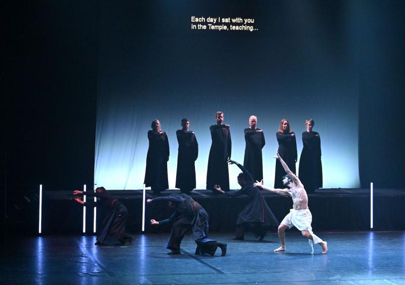 Perhaps it’s not surprising then that betrayal with a kiss dominated the first “nocturne” for Maundy Thursday. The production’s starkly elegant staging had Damiano Bigi’s Christ dressed in white and the six singers and three other dancers dressed in black, but there was no Manichean sense of good versus evil in what ensued.