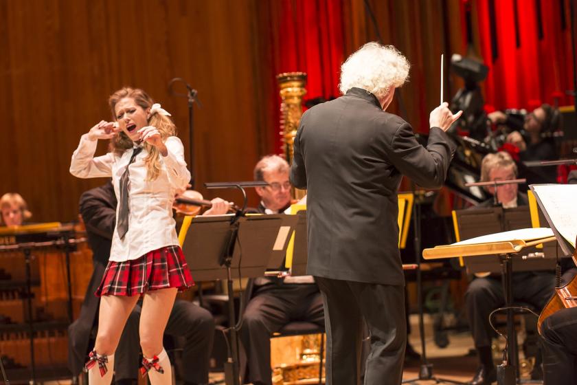 Such demonstrative physical and musical flexibility, as well as the interval for a saucy costume change, have allowed her to bring down the house many times in Ligeti’s Mysteries of the Macabre, and she has developed a slick act with Rattle. She now appeared not as leather-clad dominatrix but naughty schoolgirl  still tossing off Ligeti’s coloratura pyrotechnics while barking and hissing her arbitrary instructions: beyond parody, which may be my problem with both Elgar Howarth’s arrangement and a performance that has lost touch with the political and cultural disenchantment which drove Ligeti to write the opera, notwithstanding Rattle’s theatrical cry of anguish at "Prime Minister Farage"(Rattle reacting pictured above). The laughter can be so loud that it drowns the anger.