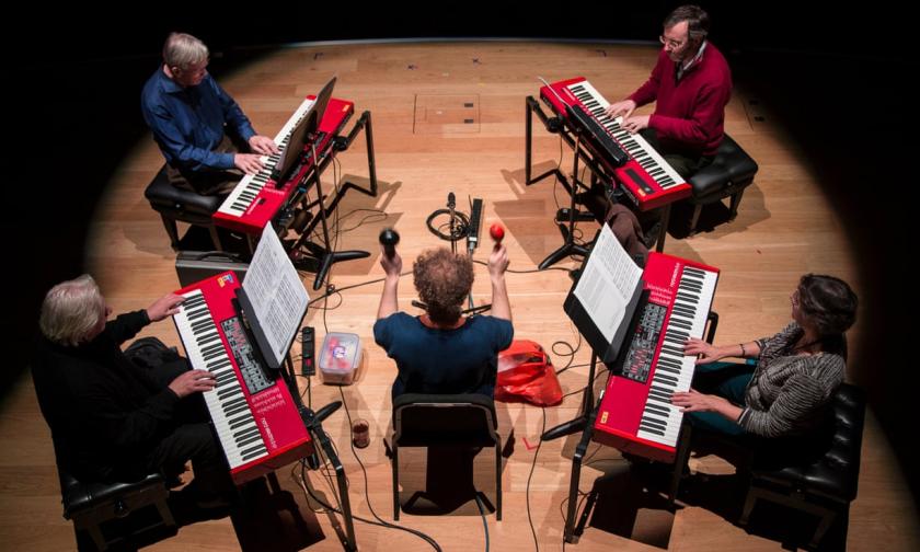 As the clock struck eight, we moved on to a segment of American Minimalism. Morton Feldman’s Bass Clarinet and Percussion is a typical late work, with quiet repeating modules in the clarinet accompanied by two percussionists, playing inscrutable, quiet clusters in rhythmic unison. Feldman often makes huge technical demands on his players to only middling musical effect for his listeners, but the efforts of these three performers mostly paid off. Clarinettist Robert Plane sometimes struggled to maintain the evenness of his tone, especially in the continuous high, quiet music, yet the endlessly still mood persisted, and to eerie effect. This was followed by Steve Reich’s early work Four Organs. This is Reich at his most confrontational, presenting simple rhythmic patterns in gradual evolution, without any apparent concern for the musical implications of their resulting dissociation. But the squelchy, analogue synthesisers provided appealing period sound. Kudos, too, to percussionist Louise Goodwin, who had the unenviable task of playing a continuous quaver pace on maracas throughout the whole work.