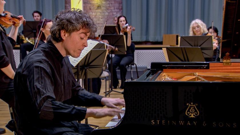 So first we see again the little sequence of musicians heading through Manchester city centre to Hallé St Peter’s, and before the music starts Paul Lewis introduces Mozart’s Piano Quintet in E flat K452, and Sergio Castelló-López, clarinet, and Elena Comelli, bassoon, chat to him about it (with a few black and white rehearsal clips).