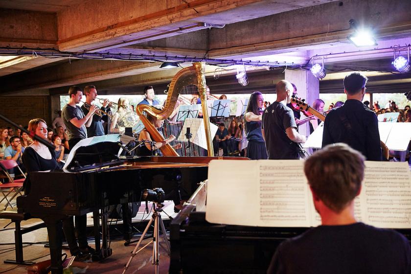 It began with the trembling bow of Sally Pendlebury’s cello, open fifths sounding almost painfully vulnerable in the museum’s wide hangar. American composer Caroline Shaw’s In Manus Tuas explores "slices" of Thomas Tallis’s motet. It takes nerve to draw husky, dead whispers on an instrument designed to sing, but Pendlebury’s timorous opening made the flowering that followed all the more entrancing. Her own, quiet soprano joined plangent chord sequences, rising to rapid arpeggios beating with the airy ease of angels’ wings. After a tour de force of repetitions - New York underground meets Tudor chapel – Pendlebury came to rest on a simple G major broken chord, sweeping into harmonics – and silence.