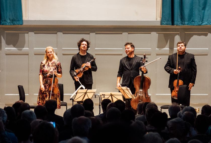 The keynote was a beautiful sense of balance, be it the balance of the four musicians, or the balance of major and minor in Schubert’s final quartet. In the first of Haydn’s Opus 76 quartets, with which the concert opened, the balance was between seriousness and fun, something evident right from the start where they played Haydn’s opening smile with a breezy sense of line married to a transparent feeling of musical development. They played the gorgeous, hymn-like melody of the slow movement with dark-mahogany tone, and then sounded like they were having enormous fun in the Menuet (they looked like it, too: cellist Peter Jarůšek involuntarily stuck out his tongue as he played).