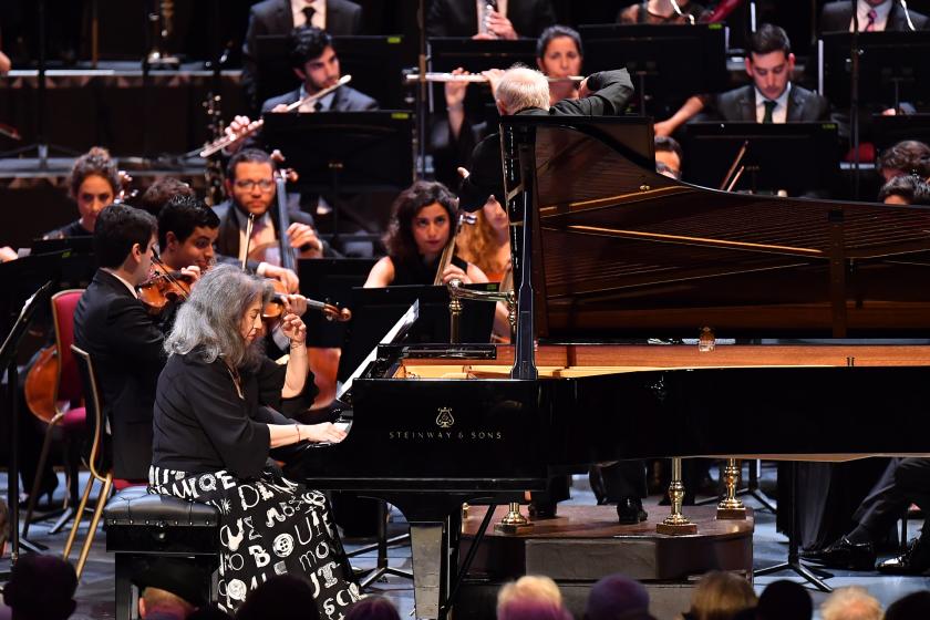 Kudos, as always, to the ongoing WEDO project of Barenboim and the late Edward Said as it brings together Jewish, Muslim and Arab Christian musicians from the Middle East and Spain in its four-year degree programme (the latest group enrolled in 2015). It's always a shame that for security reasons the players can't be named so that one can't give due credit, for instance, to the powerful first oboist. The strings' hallmark fervour duly flamed at the heart of the two movements in Schubert's "Unfinished" Eighth Symphony. They were earthed by Barenboim's care over phrasing and encased with pianissimos encouraged by a master who has always stated that in the Albert Hall, you draw the listener in rather than force the sound out. For a conductor who often tends to the grandiose, Schubert's Andante con moto lilted at a fair speed, though it was a mistake, given this tenderness, to ignore the Allegro moderato's exposition repeat (according to Elisabeth Leonskaja, when any student omitted repeats in the sonatas, Sviatoslav Richter would ask "what? You don't love Schubert's music?") After the total "we're in it together"ness of Nicola Benedetti, Mark Wigglesworth and the NYO in Tchaikovsky's Violin Concerto earlier this Proms season, it was sometimes dismaying to see Martha Argerich (pictured above) ploughing her own furrow in the First Piano Concerto. Those massive chords as the big tune unfurls near the beginning might have been a warning: much too loud (at least from where I was sitting) for the string melody they are there merely to support; in any case, we now know that Tchaikovsky's original idea for the piano was gentler. Argerich wasn't going to adopt that, though many pianists do. She had her own idea about the tempo for lyrical respite - faster than Barenboim's and the orchestra's - and only let her magic truly work when the theme emerged around an exquisite trill on piano only.