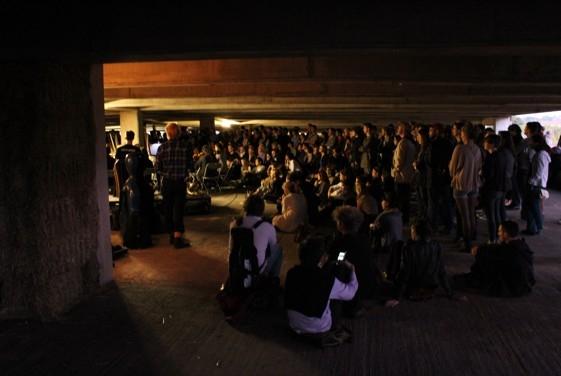 Ironic jumpers stood in for white tie, red stripe for interval ice creams. Thundery passing trains deputised for tannoy notices. And a mass of young hairy creative types stood, sat, crouched, knelt, drank and huddled in front of a twitchy young scratch orchestra and the London skyline beyond. It was the latest and most sophisticated multi-channelled collaboration to hit London, with gallerist Hannah Barry teaming up with composer-impresarios Gabriel Prokofiev and Kate Whitley of Cambridge University.
