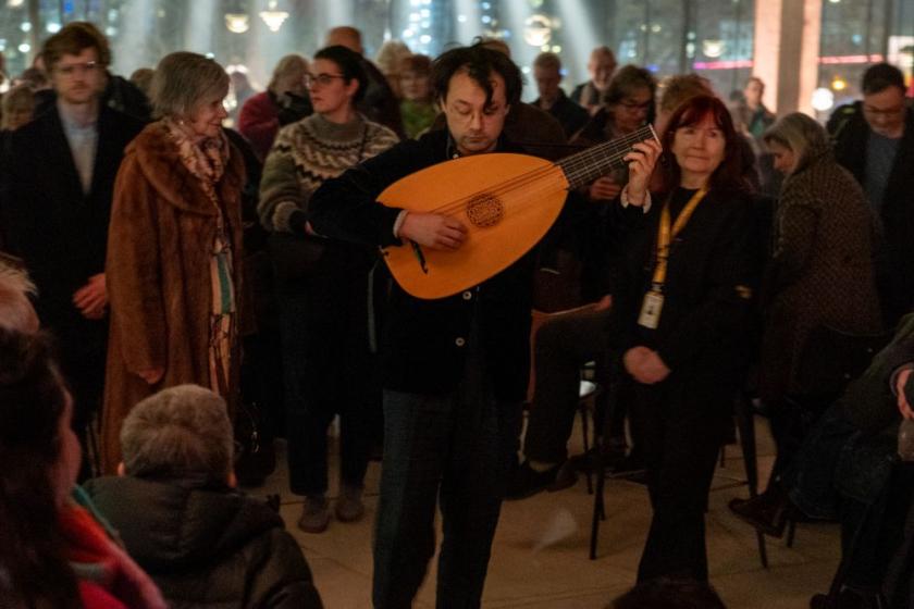 It didn't all work, but kudos to Shibe for trying. One overheard, rather than fully heard, the subtly dancing lute pieces (only the clavichord is quieter, surely). Shibe strolled around strumming on a creaky block of four platforms surrounded by candles, seats laid out on one side for those who claimed them quick enough, and bring-your-own for the rest of us to turn it into a concert-in-the-round experience. It started with his back to many of us, with the score in front of him, but to do him credit, once he noticed we were there too, he delivered quite a bit of the first part to us, with a noticeable drop in volume once he turned around.