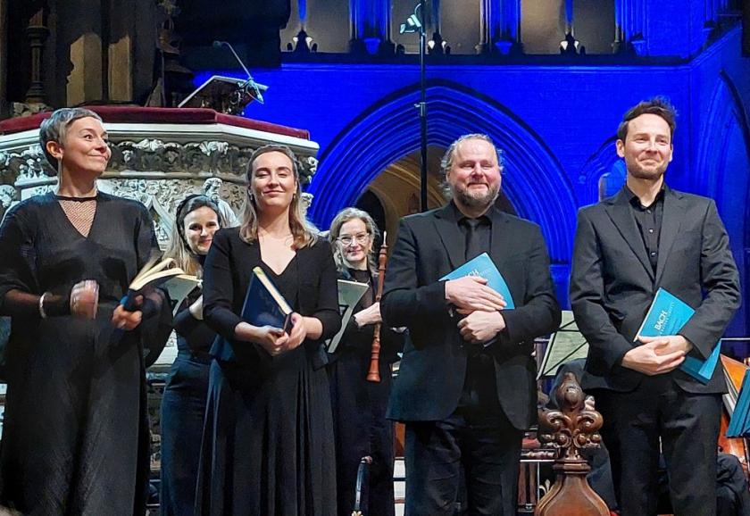 His Evangelist was a late replacement for Sebastian Hill: light, high tenor Christopher Bowen (pictured above with William Gaunt and Sarah Anne Champion in the ripieno choir, plus violinists of Orchestra 2 Anita Vedres and Conor Gricmanis), who nevertheless mustered the bite and vigour for the more angry sequences, and matched the climactic anguish of Long’s “Eli, Eli, lama asabthani” with an equally lacerating “O God, why hast thou forsaken me?”