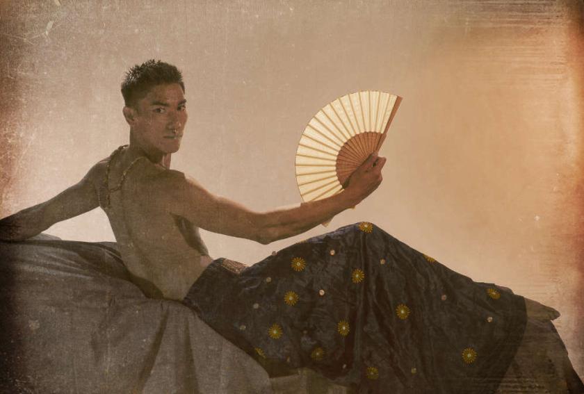 But then the young man (Sooraj Subramaniam) finds himself absorbed in a dream reenactment of the ballet’s legendary Kingdom of the Shades scene, over which we hear Gautier, in the velvety, Epicurean tones of voice artist Benedict Lloyd-Hughes, marvelling at the animalistic grace and “unimpeachable authenticity” of the “bayadère” Amaty he met in Paris, poring over her physical features (“skin: swarthy, gums: blue, teeth: black”) with an aesthetic fascination very close to sexual obsession. On stage the dancers enact both the gazing and its violent, invasive subtext: Subramaniam is brilliantly sinuous as the temple dancer on display, graceful, girlish, and impassive, while around him the company’s female dancers are pushed to the ground, flipped over and have their legs pulled apart while Gautier’s voice describes the enormous holes in Amaty’s earlobes. That voice comes from behind us, all around us as we watch, leaving us unavoidably implicated in Gautier’s objectifying, rapacious gaze. It is, as it ought to be, a genuinely disturbing experience.