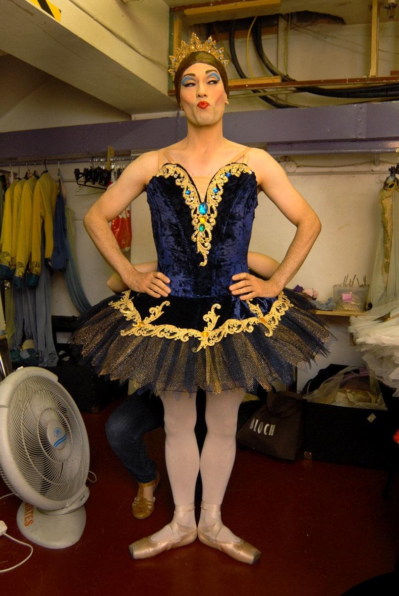 We hire professional classically trained dancers, so they know what the dancing is. But the shock is doing the comedy. Of course you haven’t done female dancing, and you have to get on pointe, but that’s a small adjustment, not too far from what you’ve been doing. Comedy though is quite far away. Now, first I put on a dance belt and pink tights for the diva.