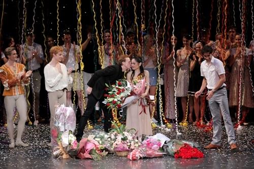 In fact, hardly had she become his protégée than he died, and most of her career was shaped by the choreography and artistic taste of her future husband, Peter Martins, the star dancer who inherited the NYCB directorship. The farewell-Kistler pieces by critics have united in regretting that both serious injury and the increasing distance from Balanchine’s era took a heavy toll on her artistic effects. (Above right, Kistler's final bow photographed by Paul Kolnik)