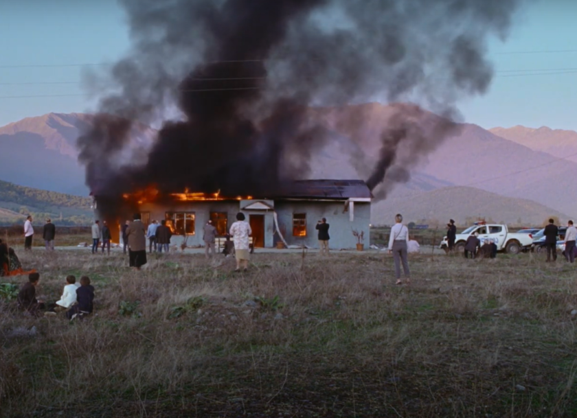 For a film that increasingly concentrates its attention on an ever more enclosed world, Beginning begins in relative openness, albeit within the strictly defined space that is a Jehovah’s Witness community in a small Georgian country town. Kulumbegashvili and her cinematographer Arseni Khachaturan (filming on 35 mm) relish long static camera shots and the opening take, some eight minutes in length, sets the atmosphere as Yana (IIa Sukhitashvili) welcomes the congregation to the prayer hall presided over by her husband, the community’s minister. No sooner has David (Rati Oneli, a longterm collaborator of the director who is here both co-writer and producer) started the day’s discussion than the building is fire-bombed, its ordered tranquillity transformed in seconds into flaming chaos. (The subject that David had been embarking on was Abraham’s sacrifice of Isaac, and the burning building, main picture, hints at just such a climactic moment in Andrei Tarkovsky’s The Sacrifice.) It’s not the first hostility that this community of Witnesses has experienced at the hands of suspicious locals, and there’s no expectation that the crime will be solved.