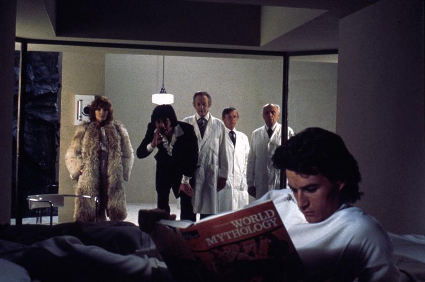 The Final Programme is the least of Moorcock’s Cornelius Quartet, a relatively simple dry run for later entropic epics, and Fuest lifts some scenes straight as Cornelius (Jon Finch) attends his father’s funeral pyre, then becomes part of a quest by competing parties for microfilm which will unlock the titular programme, intended to create “an all-purpose human being. A hermaphrodite in every respect”, as conventional humanity sinks to its doom. Timely now, the idea of a post-gender world also chimed with 1973’s glam-rock UK, even if Cornelius, drifting through an apartment with Peter Blake’s Babe Rainbow on the wall, remains in a Sixties fug.