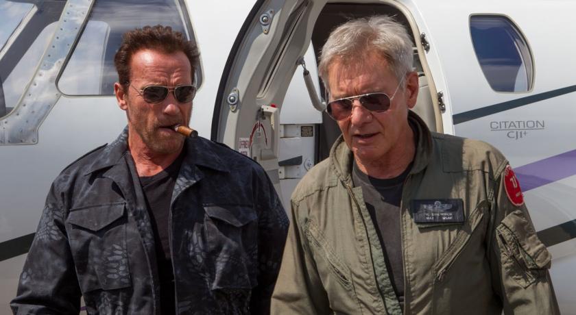 This sort of wry in-jokery is a large part of The Expendables' croaky charm (though Snipes looks indecently sleek and svelte), and a whiskery, cigar-chomping Arnold Schwarzenegger (who plays Trench) obligingly reprises his "let's get to da chopper!" line from Predator. The Bruce Willis character, Church, isn't here this time, but instead we have Harrison Ford as Barney's gruff CIA handler Max Drummer. In the interminable final battle scene, where the Expendables have to grapple with the entire army of Wazistan or Azistan or somewhere equally spurious, Drummer gets his own Han Solo routine in a tankbusting helicopter.
