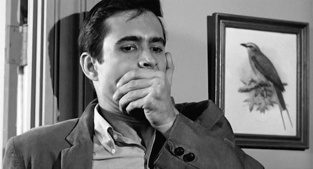 After the murder, there is a nine-minutes 40-seconds wordless sequence during which Perkins clenches his teeth and sets his jaw, as he takes on the task of meticulously cleaning up the bathroom, getting rid of all the blood and the body. Perkins indicates that Norman is no longer a boy but a determined man with serious business on his hands. Biting his lower lip, munching candy, and looking around warily like a bird of prey, he watches as the car slips slowly into the swamp (see video below). A flicker of a smile plays upon his lips, and he gives a look of satisfaction.