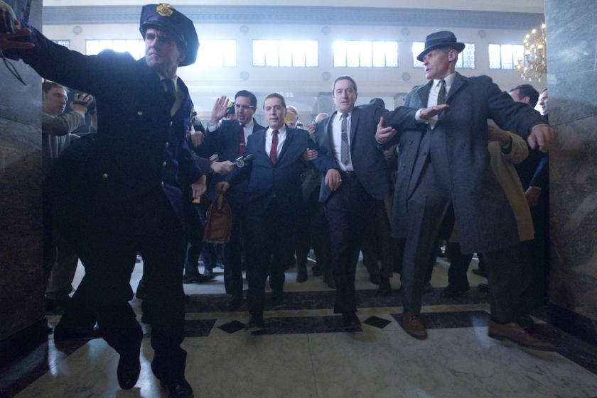 Adapted from the book I Heard You Paint Houses, by Charles Brandt, it charts the life and times of Frank Sheeran, a rare Irishman to have worked for the Mafia, who before his death claimed to have killed infamous trade union boss Jimmy Hoffa (whose disappearance in 1975 has never been solved) on instruction from his underworld bosses.De Niro is Sheeran, who we first as the elderly resident of a nursing home, and through whose memories screenwriter Steven Zaillian (Schindler’s ListGangs of New York) navigates his plot, principally from the late Forties to the Seventies. Returning from WWII as a “working stiff” with no direction but a nonchalant gift for killing, Frank’s life changes when he’s introduced to Mafia don Russell Bufalino (Pesci, pictured above left with De Niro). Russell employs him as a heavy and hitman, becomes his mentor, then lends his services to Hoffa (Pacino), the corrupt, fatally hot-headed Teamsters president.