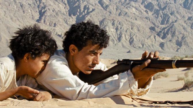 Their journey across this rough, flat landscape surrounded by rocky escarpments rising in the distance is engrossing – we understand how camels have come to be known as “ships of the desert” – but its mood gradually changes, and a mounting sense of threat appears. Conflict arises suddenly, but its impact is extended through an unsettling night scene in which Theeb and his brother, in hiding, are haunted by their opponents’ taunts ringing around the rocky canyon that shelters them.