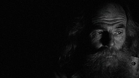 Eight-and-a-half minutes from the end of the film, the man is sitting by the fire. The fire is crackling. The scene begins to fade.