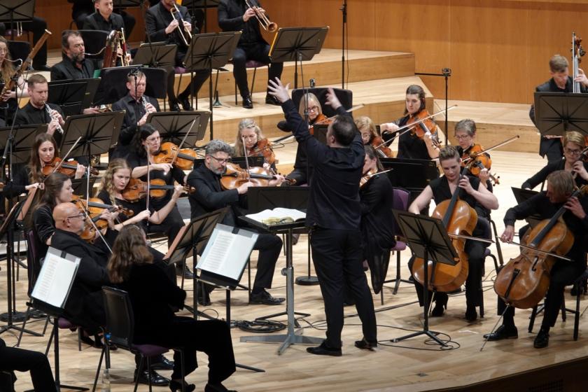 The overture began gently enough, but it wasn’t long before the brassy firepower was unleashed, along with thundering timpani. Gernon’s flowing (and stickless) beat, and his separation of the music into broad paragraphs, is always a boon: here we heard the contrapuntal mix of themes to fine effect (with a gesture to the tuba, of course, for its own brief notable motif), and warmth and what Elgar would have called “manly feeling” in the strings, led by Zoe Beyers. The approach to the last big reprise made a glorious noise.