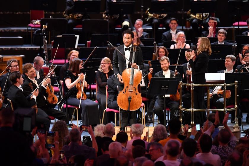 Elgar’s Cello Concerto was premiered the same year as the Howell but its trajectory has been quite different, accepted as the late masterpiece of a great composer. It was played by Sheku Kanneh-Mason, who has been lionised since winning the BBC Young Musician in 2016 and whose picture appears no less than four times in the concert programme. I hadn’t heard him live before, and I have had a number of experiences of cello concertos not coming over well in the Albert Hall. But there was nothing to worry about, Kanneh-Mason (pictured below) projecting the opening bars powerfully, but still with the suggestion of playing to himself. Part of the success is down to Elgar’s subtle scoring, occasionally allowing the orchestra free rein but mostly paring down the instrumentation when the cello plays. Gražinytė-Tyla was a subtle and fluid accompanist and the orchestra sensitive to Kanneh-Mason’s nuances.