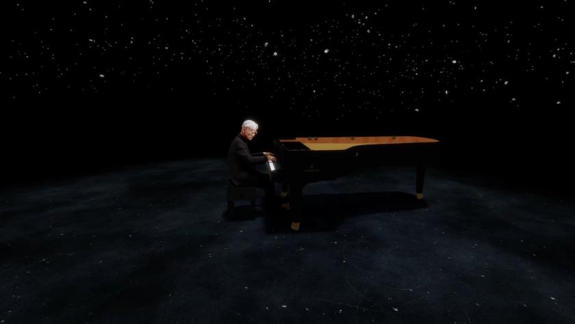 What they’ve created is, as the producers acknowledge up front, not perfect – there’s a low-res aspect to what we see which means that it’s difficult to lose consciousness of the artificiality of the experience. This shows not least with the piano itself – details such as the wheels and pedals look yellow rather than metallic. The fact that Sakamoto dematerialises in between each number – presumably to avoid “jumps” in his physical position from one piece to another – also interrupts the capacity to completely lose yourself in the illusion.