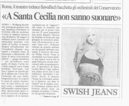 Secondly, the part of the article that moved the Santa Cecilia players to call in their lawyers was not the text of the interview with Sawallisch as such, but the headlines which some anonymous sub-editor at Il Messaggero had come up with. The main article on the arts pages was succinctly and cleverly titled “Sawallisch: Allegro ma non troppo”, (which hardly needs translation), qualified by a slightly brusquer subtitle: “Il Maestro: l’orchestra di S. Cecilia non è all’altezza del suo ruolo” (they are not up to the job). Meanwhile, the front page teaser went in for the kill, taking a few liberties with the piece itself: “A Santa Cecilia non sanno suonare” – they can't play properly.