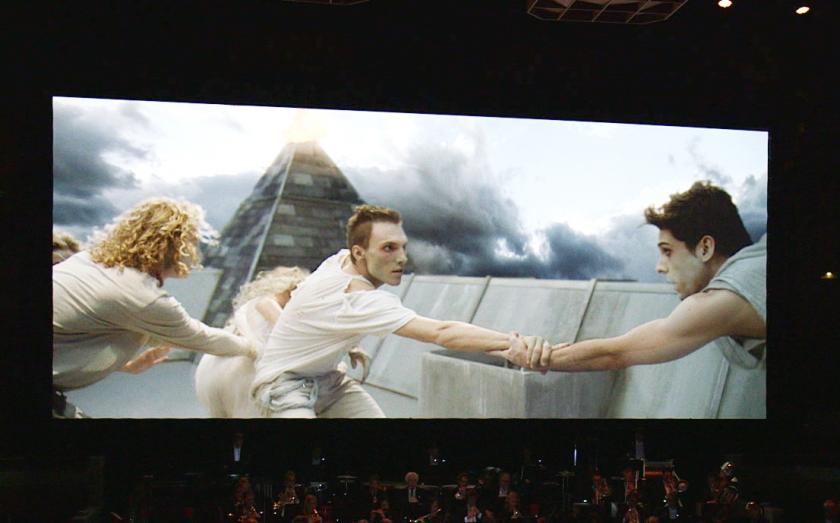 It’s the brainchild of Lucas van Woerkum, who is that soloist, appearing on stage next to the rostrum like a concerto virtuoso, with a touchscreen as his instrument, and taking his bows alongside the maestro – in this case Ben Gernon, who’s done this kind of thing before with the BBC Symphony Orchestra. But it was a first for the BBC Philharmonic and Manchester. The programme was all ballet music – Stravinsky’s The Firebird and the two suites which are in fact unedited chunks of Ravel’s Daphnis et Chloé (pictured below). They’re music conceived for the theatre, clearly, and to realise a visual element it’s probably less expensive to make and show a digital silent film than to bring in a complete ballet company in a staged production.