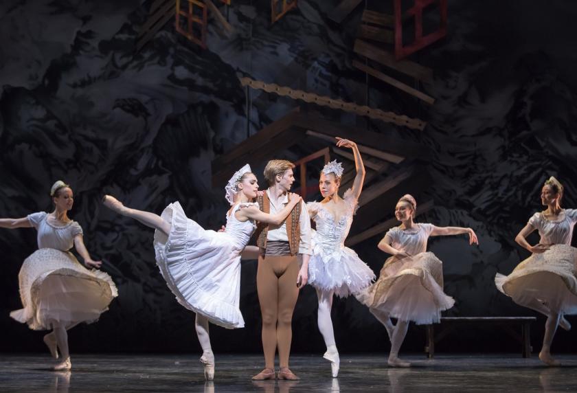 Scottish Ballet, who have produced this reconstruction, unfortunately lack the star power that might have animated the solo parts: Constance Devernay and Andrew Peasgood are bland as the Fairy and Young Man. Bethany Kingsley-Garner does better with the lush choreography for the fiancée (Lynn Seymour’s part). No-one is helped, in my opinion, by Simon Bennison’s lighting, which is deliberately unnatural against the photo-realistic Alpine backcloth. For the latter, and the extremely clever impression of a village he conjures from an assortment of roofs and windows, designer Gary Harris deserves plaudits, but not for the decision to picture the Fairy in ragged tutu and large sparkly headdress, which is a nod no doubt to Baiser’s roots in 19th century ballet but serves only to make the character even harder to comprehend. (Main picture, Bethany Kingsley-Garner, Andrew Peasgood, Constance Devernay)