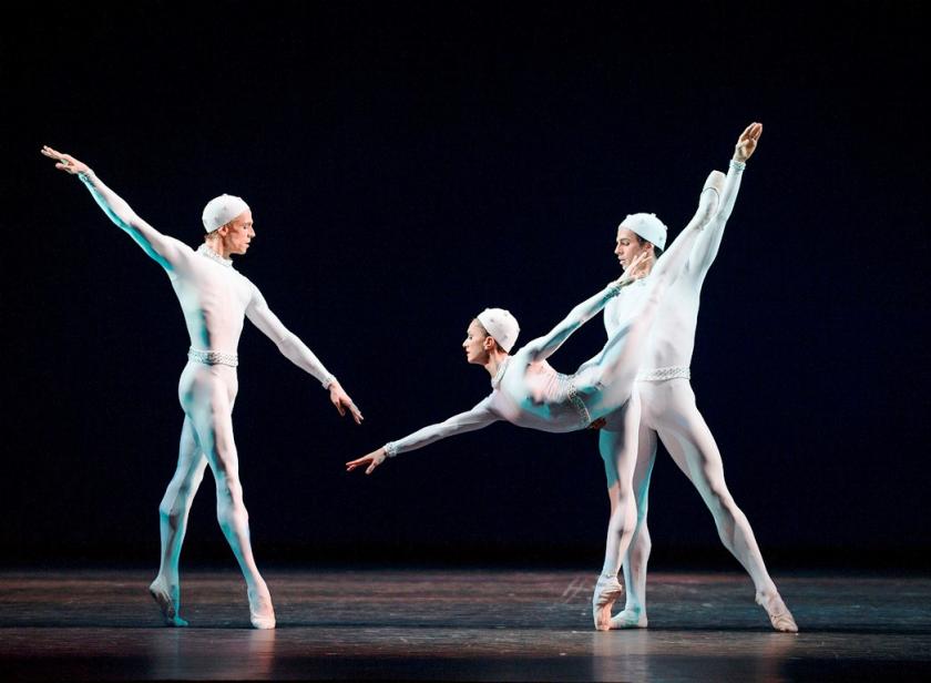 By contrast, Yuhui Choe and Alexander Campbell (pictured above right) made fine work of the Voices of Spring duet created for a production of Die Fledermaus. Campbell’s neat, beaten footwork was a pleasure (as is his Tintin-style quiff), and Choe’s little farewell flutter of her arms in the final lift was as joyous as it was unexpected.