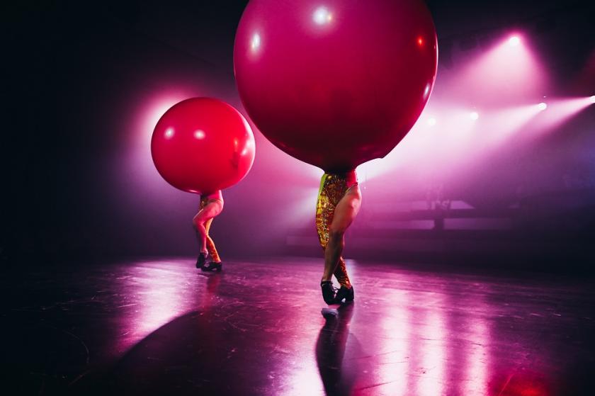 You can’t win ‘em all, and personally I could have done without the second turn from Emer Dineen as English cousin (col ceathrair) and drag king Duncan Disorderly, but the crowd loved the participation, and it added another strand. On the other hand I laughed myself senseless with ongoing amazement at what Connaughton and Deirdre Griffin could do with two giant balloons above and, eventually, over their heads.