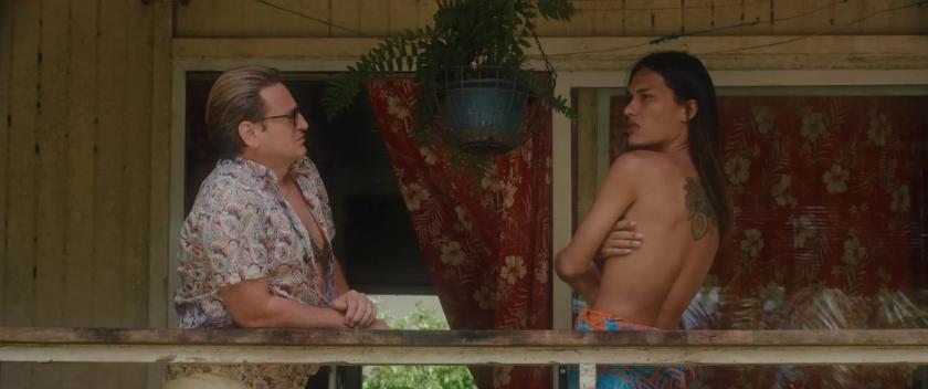 De Roller loves hanging out backstage at the garish Paradise nightclub and catches the eye of a beautiful trans woman dancer, Shannah (exquisitely played by Pahoa Mahagafanua in her debut). When she’s working her hotel reception day job, he pumps her for information about the Portuguese. (Pictured below: Mahagafanau, centre, and Magimel)