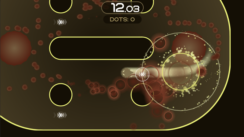 Of course, zipping about isn't the end of it. Every glowing dot you gobble up leaves behind a sort of spectral dot that will attempt to follow you and destroy you on contact. The spectres move in a loose flock-like formation but are predictable enough that you can rely on them to be in roughly the right place when you zoom back around their neck of the woods following a tricky curve.