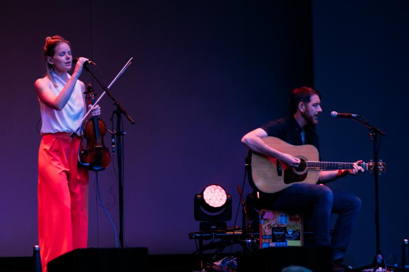 Fara, a trio of Orcadian fiddlers plus a keyboard player from the west of Scotland, performed a rousing set on Wednesday night. The collaborative approach they take to writing music is evident by both the ease with which they play as a band, and their funny interjections about one another between sets. A tune written by fiddler Jeana Leslie as a birthday present for her mum featured beautiful, slow, interweaving melodious, which then moved into the more upbeat Seven Eight NEIN!, named after fellow fiddle Catriona Price’s German mother’s outbursts when they played together as children. A lot of their own compositions are songs set to the words of Orcadian poets. A setting of Christina M Costie’s Spear thoo the Wast Wind (Ask the west wind) saw some lovely harmonies sung by all three fiddlers, as did Love gathers all, titled after the refrain in Edwin Muir’s poem "Song", which featured soft chords from the keys and a gently rocking pizzicato motif from the fiddles.