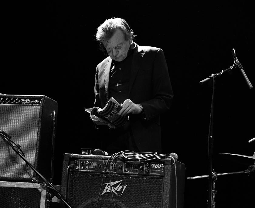 Smith centred it all, right from the start, vocalising sight unseen over a slab of opiated electronica before the group’s entrance. Through extended, explosive live accounts of “Wise Ol' Man” and Sublingual’s best track “Auto Chip” to a heavy, dark “Hittite Man” from 2013’s Re-Mit, he sounded strong, focused, engaged, and even theatrical – hamming it up as he randomly set about Poulou’s keyboards with brute force, finding new ways to torment the sound desk with mic feedback, hunched over the amps at the rear, then stepping back out to fling his arm around Peter Greenaway’s neck, grinning like Salford’s answer to The Joker.