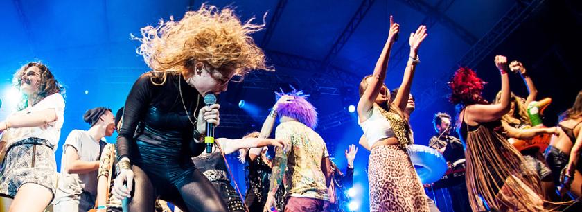 Samantha Urbani is one of the sassiest frontwomen in all pop, a sexy, feline creature whose polyamorous lifestyle fuels her lyrics and adds to her projected sensuality. She sits outside Brighton seafront venue Coalition, watching water-skiers ride the mill pond sea in balmy summer heat, but one whisper from a bandmate in her ear and she's onstage within a minute, attacking opening song "Shattered". She wears a faded denim jacket with a yin-yang logo on the back, a white New York baseball cap, hot pant shorts with bulbous gold trim and a necklace of giant ersatz pearls. Behind her a large LED screen announces that this is, indeed, Friends.