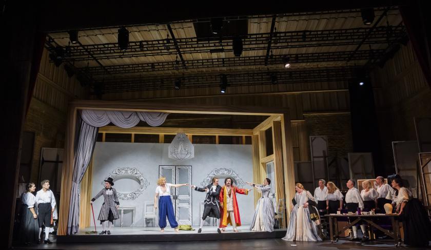 At the Nevill Holt festival in rural Leicestershire, Opera North show how the reality of conflicted human feelings triumph as they break free of this mechanism of deceit. For the company’s first instalment of a five-year deal with the festival, director Cecilia Stinton gives us a nest of theatrical boxes: stages within stages, frames within frames. Alfonso and his male accomplices endeavour to perform their dramatic proof of all women’s fickle and inconstant natures – così fan tutte. Here, however, women can read the script, modify their parts, and turn the tables on the director.
