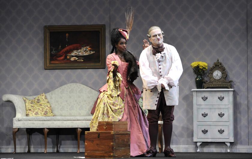 If this Malatesta (pictured above, centre, with Mariam Battistelli, Tom Mole, seated, as the notary, and Ricardo Seguel) sometimes seems to have dropped in from opera's harsher verismo future, elsewhere the rococo costumes and designs conjure up a world of regulated intrigue and discreet naughtiness such as Fragonard or Watteau might have painted, as Hansen backdates Donizetti’s 1843 work by 70 years or so. Undergarments feature heavily (or rather, scantily), from Pasquale’s pyjamas as the old goat falls for the oldest marriage-plot trick in the book, to the culottes in which Norina swaps the moonstruck idiocy of romantic novels for the grown-up fun of deceit in the service of true love (if it really is that…). We glimpse a polite society en déshabillé, with its underlying motives shockingly on show. The revolving stage ensures swift and seamless movement between the three rooms – Pasquale’s, Norina’s and the ramshackle nephew Ernesto’s – where plots hatch and desires come to light.