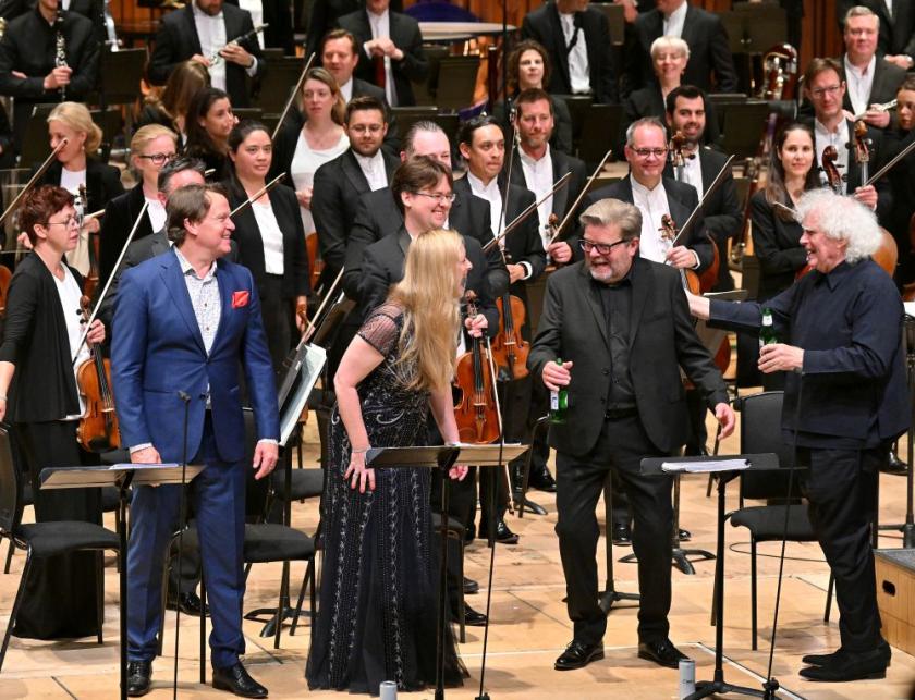 Equalling it were the patriotic choruses from the men of Nigel Short's Tenebrae: thrilling heroism indeed, and complemented up by the wonderful sound of Bart Van Troyen's bagpipes (pictured below alongside the double basses). Janáček excels himself in blending comedy and conflict, as another lopsided waltz of the kind that populate Part One takes over from the threat of violence and Brouček finds himself, dirty but alive, crawling out of the barrel in which he's spent the night. There were no weaknesses in the large supporting cast, with further outstanding soprano lyricism from Doubravka Novotná and yet more tenor clarity from Stephan Rügamer and Lenard Vrielink. Crowe, transforming into a portmanteau version of the ideal Janáček heroine, managed to pull at the heartstrings as brave Kunka, embodying every emotion with the same kind of economy as Hoare. Ultimately, though, it was this Brouček's night, and Janáček's as embodied in the luminous sounds of the LSO under Rattle. Right now, Janáček earworms have even taken the place of Valkyriemania. Na zdraví, and to what should be a perfect recording too.