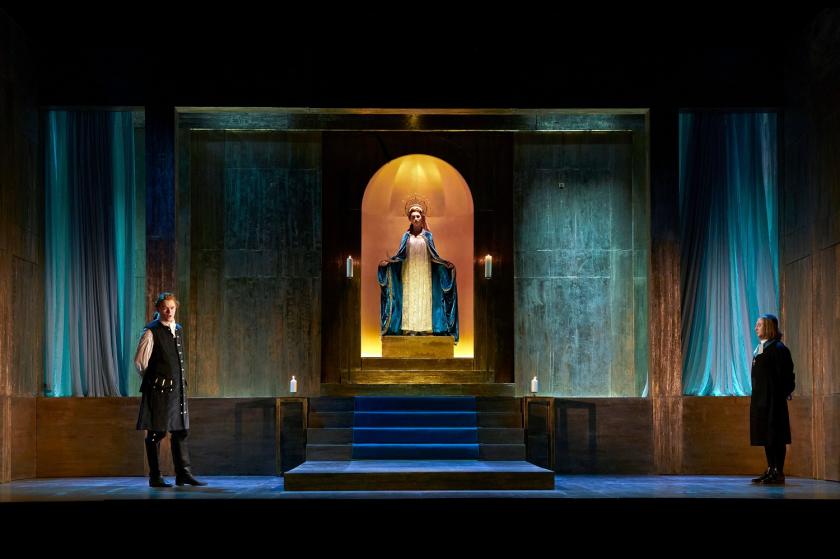 Director James Conway and designer Cordelia Chisholm take a non-committal approach to the Egyptian setting. The set is made up three tall walls in a muted patina gold. This proves an ideal medium for the lighting effects (designer Joe Kirk), though the changes are of mood rather than setting. Costumes suggest the London of Handel’s era, drab but coherent. Conway employs modest props, notably Pompey’s head, which is made of glass and is later shown to hold his ashes. In one climactic aria these are poured onto the stage and billow into the auditorium.