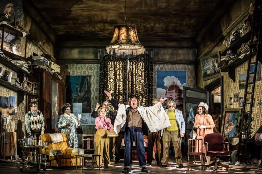 All this is brilliantly stage-managed, whatever one may think of apostrophes to Florence, Giotto and the Medici, and amputation as a penalty for will impersonation, in 1960s Italy. Buoso’s “mansion” is more of a huge first-floor bedsitter, chaotic even before the cousins start ransacking it for his lost will. Schicchi himself is a navvy in jeans and a leather jerkin. But the staging has such wit and pace that incongruity vanishes in the face of entertainment. Roland Wood has more time than Vougaridou to adjust from morose barge-owner to opportunist scoundrel, and does it with verve and vocal character, not least in his squeaky Buoso imitation. Oleksiy Palchykov minces around as Rinuccio but sings his hymn to Florence in fine lyric style, as if Gianni Schicchi really were a symbol of the best in Tuscan culture. Some excellent singers are “wasted” in small parts: Rebecca Evans as Nella in a peroxide wig, Wojtek Gierlach as cousin Simone, ex-mayor of Fucecchio, among several others.