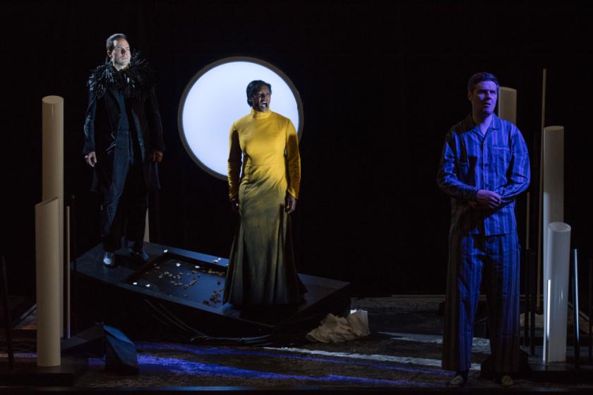 Elizabeth Llewellyn stood out as the serene Iris, soaring effortlessly through Nicolson’s grateful vocal lines with a nuanced, rich soprano of ever-changing colours. Christopher Bowen was all nervy energy as anti-hero Rawley Beaunes, with crystal-clear diction and considered meaning behind everything he sang. Andrew Fellows (pictured above left) was vocally indisposed as the Green Man, but appeared on stage anyway, lip-syncing to the singing of Oliver Hunt, drafted in at the last minute to sing from a score at the side of the stage. It was a bizarre but inventive solution to a problem that could have scuppered the whole project, and in fact the disconcertingly disembodied voice only added to the opera’s otherworldly strangeness – and both performers portraying the Green Man turned in very fine performances.