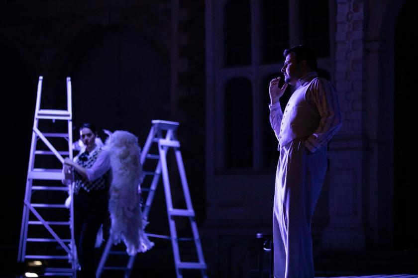 Director Julia Burbach also turns the itinerant Beppe into an ever-present winged Cupid; given the natural dramatic gifts of the splendid Kezia Bienek, more could be done here, and there’s some inertia in the staging which, as in The Cunning Little Vixen also at OHP, could easily be filled by willing singer-actors being given a bit more definition in movement. Alyson Cummins’ costumes, though, make it all look good: stylish black and white for the bachelor’s birthday, full colour (embodied first in Suzel) when love reigns triumphant. The ladders which start out as the props for Suzel’s mimed cherry-picking in Act Two – invisible objects not great when there are so many realistic ones like Beppe’s bike – turn out to be aspirational, helping love along, not a bad idea.