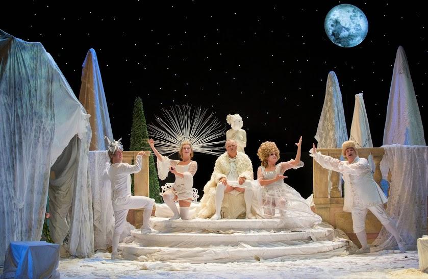 ETO Life on the MoonA lot of fleshing out is needed for a slender plot in which a miserly widower, turned into a sexist old lech in ETO General Director James Conway’s translation, finds himself gulled by a quack astronomer into believing that there’s a better life, including hot running girls 40 years his junior, on the moon. Conway, whose rhyming couplets for the recitative are better and funnier than the sometimes ungainly word-setting of the arias and ensembles, has pared away a second miser’s daughter and her boyfriend, but McCrystal doesn’t seem inclined to take the principal lovers seriously. Soprano Jane Harrington has to wearily upstage her own bravura as Clarice, while Martha Jones as her father’s maid Lisetta (pictured above on the right with Harrington, Christopher Turner and Busfield) – though she gets some nice tripping 6/8 passages – struggles to take on the role, and the interminable aria, of Lunar Empress.