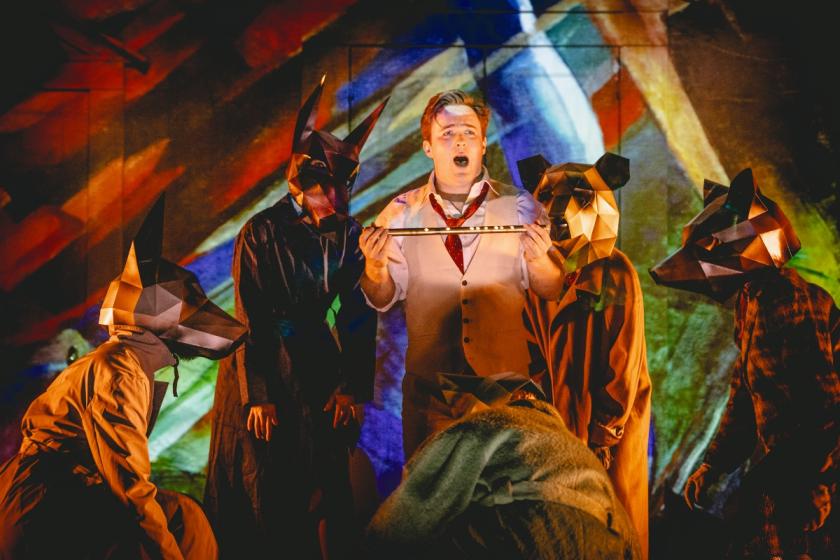 Director Michael McCaffery, however, has put imagination and invention into every detail of it, not only providing his own new English translation of the text but adapting the piece to the circumstances in some respects: his and designer Jessica Staton’s concept is that we are finding ourselves with a touring troupe of singers in the 1930s who happen upon an empty theatre. The outside world is not a friendly one, but they discover some miscellaneous costumes and some props from a previous production – very handy – and restore their faith in human values by putting on their own The Magic Flute.