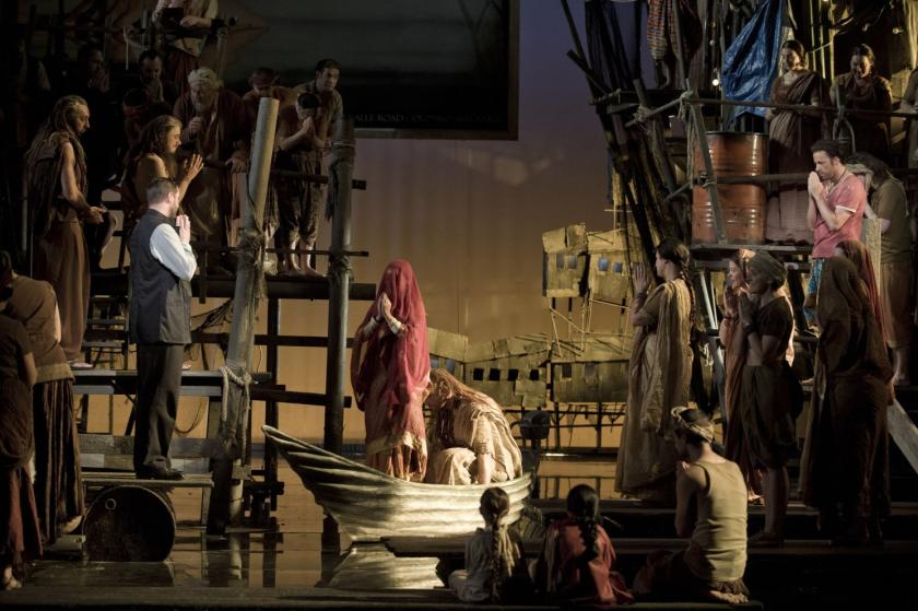 The first act’s rickety shanty-town set is enjoyably detailed and effective in placing the action on different levels, creating striking tableaux vivants in combination with Kevin Pollard’s colourful costume designs on the ragtag army of chorus and actors. The chorus is frequently called upon in this opera, and ENO’s stalwarts do a fine job. The action takes place not in ancient Ceylon, but in modern day Sri Lanka, as signposted by a looming billboard, corrugated tin roofs and oil drum floats. The point is a subtle one – that impoverished people still produce luxury goods today – and it’s in the background rather than laboured.