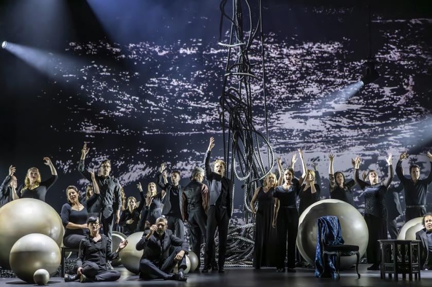 In the Grand Theatre in Leeds, where four more performances are to be given, giant “pearls” half fill the stage (pictured below: Sophie Theodorides as Leila and Nico Darmanin as Nadir) , and the first two acts have a watery video backdrop to indicate the sea (the third is of ropes in close-up and then a spectral visage, which may be symbolic of something but it’s not so obvious). There’s also, mid-stage, a sort of totem pole of tangled rope which certainly looks quite un-seamanlike, but then, as the opera’s first reviewers pointed out, the two male protagonists show very little sign of actually being involved in fishing for anything. On tour, the company will perform in concert halls, without the videos (by Joanna Parker and Peter Mumford), sets and costumes (Joanna Parker), striking on-stage lighting featuring remotely operated moving spots (Peter Mumford), or the movement devised for the chorus by Laïla Diallo.