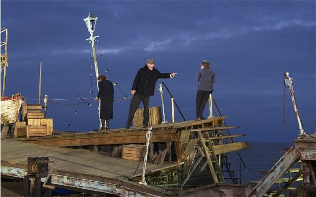 In Britten’s centenary year, the Aldeburgh Festival wanted to do something a bit special with Grimes, so they set themselves a logistical mountain to climb, booked Tim Albery to direct, and proceeded to deliver on all fronts. The audience sits facing the sea, with the stage interposed. Half the audience sits on bleachers, with the rest on the shingle in front.
