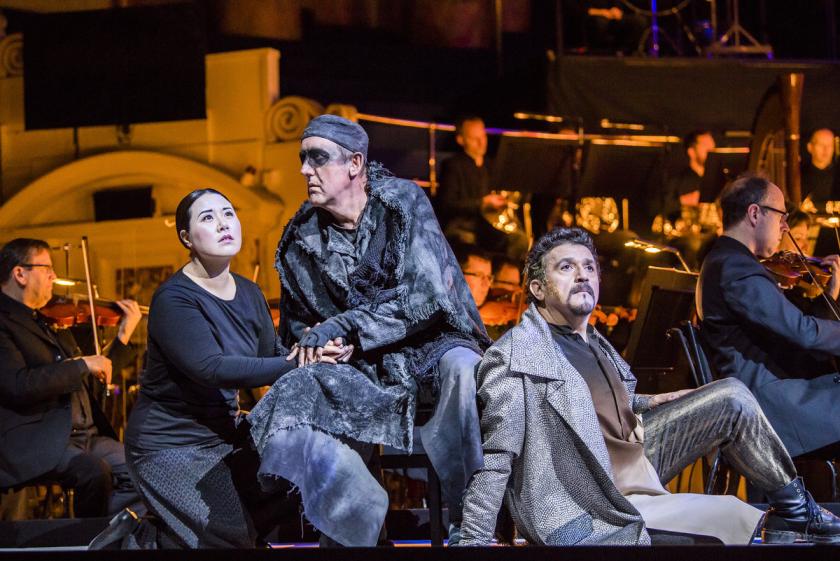I’ve seen the future, and it’s semi-staged. The gains here are far more significant than the losses. And where Opera North’s minimalist Leeds Town Hall Ring let Peter Mumford’s video projections fill in the gaps, this new production of Turandot is costumed, lit and directed, lacking only a backdrop. The chorus are squeezed stage right, tightly crammed into the choir seats. The cast gamely do their thing in the narrow space betwixt strings and stage.