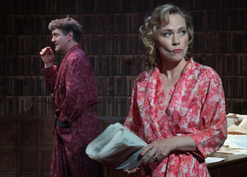 Bruce Alexander’s extorter, an eccentric blend of bogus deference and bitter envy, embodies those double standards, adopting a censorious view of events while attempting to profit from them. Hanson and Cruttenden offer a sharp rejoinder in their deeply felt portrait of a complex but loving marriage, while Jay Taylor and Olivia Darnley (pictured left with Hanson) effectively resist stereotype as Trenting’s Rotherhithe cronies. Daniel Crossley’s all-seeing butler and Claire Cox’s crisply comic society pal impress, as does James Cotterill’s set, dominated by leather-bound volumes: the ideal framework for a play paralleling audacity in life and on the page.