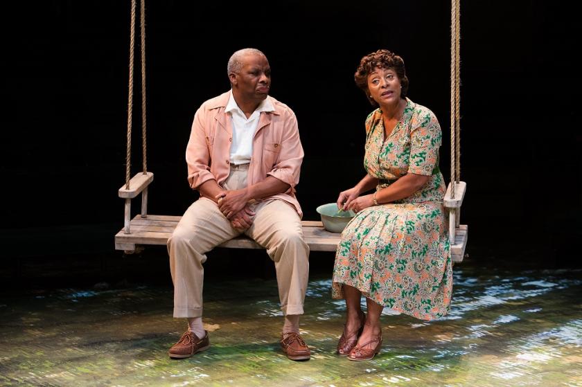 At the centre of it all is Kate, outstandingly portrayed by Croll, the protective wife and mother, hurting, brave, clinging to the hope that Larry is still alive. Despite some eccentricities, particularly of accent (sounding to my ear more Deep South than Midwest), Warrington builds to a venomous climax with powerful effect. Chike Okonkwo finely captures the character of Chris, the affable, sensible, thoroughly decent one who does take on his father in the end. And as Ann Deever, the girl-next-door girlfriend, daughter of the imprisoned patsy and holder till the end of the key piece of information that will stop Kate’s pretence about Larry once and for all, Kemi-Bo Jacobs (pictured above left with Croll) is affecting.